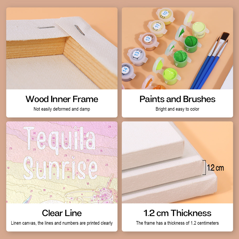 Upptäck alla viktiga saker som är prydligt förpackade i vårt Paint by Numbers-kit. Med varje komponent märkt och redo att användas kan du fokusera enbart på din konstnärliga resa. Från de livfulla färgerna till precisionspenslarna har vi sett till att ingenting står mellan dig och din duk. Detta kit är lämpligt för både nybörjare och erfarna konstnärer och erbjuder en ren, oavbruten målningsupplevelse.